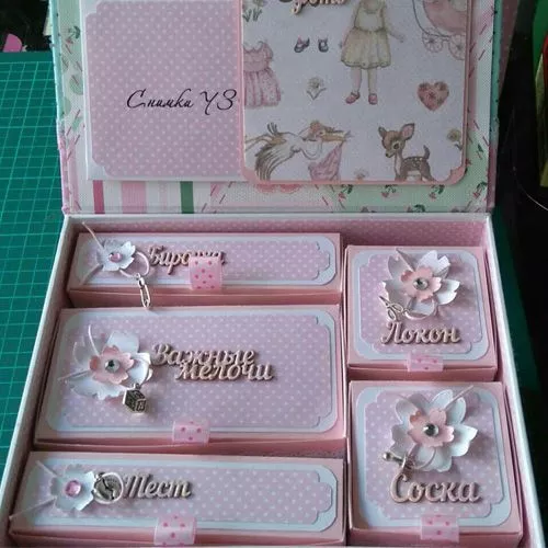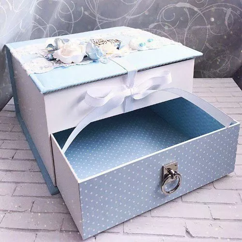 Чудесная конструкция для создания маминой сокровищницы или хранения ценных мелочей. Состоит из основы (размер 16х18х10 см), выдвижного ящика (размер 17,2х15,4х4,7 см), 3 маленьких коробочек с откидной крышкой (размер 4,8х7х3,8 см) и 2 больших (размер 7,2х9,4х3,8 см). Основа и выдвижной ящик выполнены из толстого переплетного картона, коробочки из плотной бумаги. Для такой заготовки можно создать, проявляя фантазию, свою особенную крышечку, которая подходит именно Вам