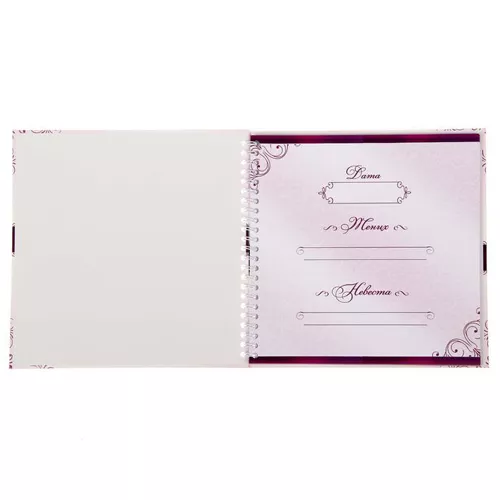 Размер книги 22х21 см. Внутри 40 разлинованных листов, скрепленнных пружиной. В комплект входит ручка с пером, которая подчеркнет торжественность события