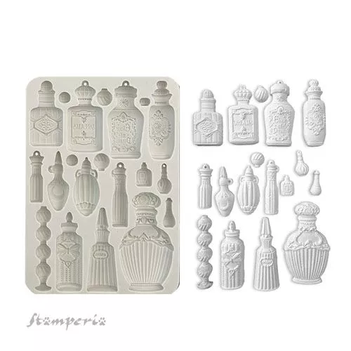 Молд А5 с 20 деталями в форме флакончиков и бутылёчков. Размер получаемых деталей от 0,7х1 см до 5,5х9,3 см. Можно использовать для текстурирования мягким состав.