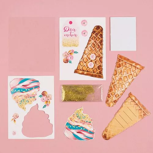 В набор входит заготовка для открытки, лист с высечками из плотной бумаги, пленка, клеевые подушечки, глиттер. Размер открытки в готовом виде 10х14 см