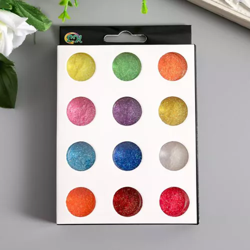 В наборе 12 пластиковых баночек с крышечками, разного дизайна. Вес одной баночки около 7 гр