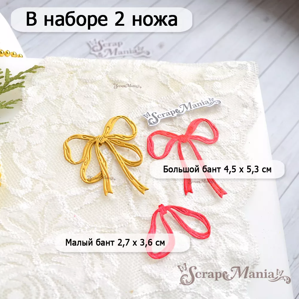 В наборе 2 ножа, соединенных перемычкой, которую при необходимости можно перекусить. Общий размер 5,9х5,9 см. Размер большого банта 4,5х5,3 см, малого 2,7х3,6 см. Прекрасно подойдет для создания декора к зимним страничкам, новогодним альбомам и открыткам. Сочетается ножами из серии "Ароматы Нового Года" (арт. 252283, 252287 и др), отлично дополнит композицию, собранную из вырубки этой серии