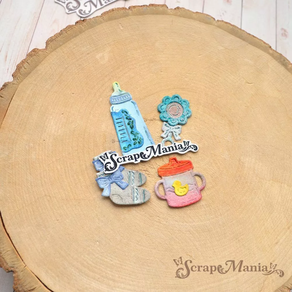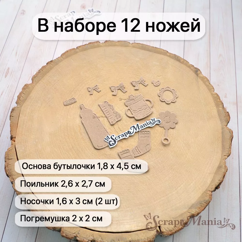 В наборе 12 ножей, соединенных перемычкой, которую при необходимости можно перекусить. Общий размер ножа 6,3х7,8 см. Размер бутылочки 1,8х4,5 см, декоративных элементов для бутылочки 1,2х2,5 см и 0,7х1,3 см, поильника 2,6х2,7 см, погремушки 1,8х3,4 см, декоративных элементов для погремушки 2х2 см и 11х1,3 см, носочков 1,6х3 см (2 шт), бантиков 1,3х1,6 см (2 шт). Чудесный нож позволит Вам проявить невероятную фантазию в своих работах. Компонуйте, меняйте, переставляйте местами вырубку и создавайте свой невероятный дизайн. Отлично сочетается с другими ножами из серии "Детство" (арт. 255645, 255652 и др)