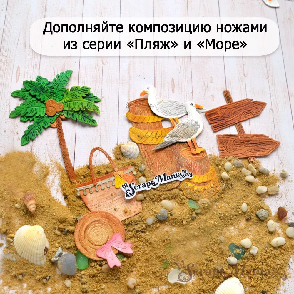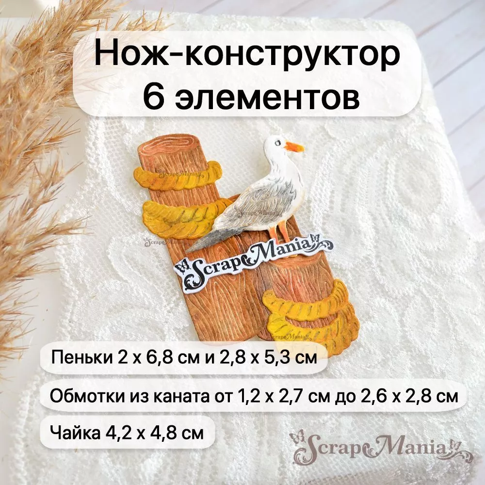 В наборе 6 ножей, соединенных перемычкой, которую при необходимости можно перекусить. Общий размер ножа 7,5х9,8 см. Размеры: пеньки 2х6,8 см и 2,8х5,3 см, обмотки из каната 1,2х2,7 см, 2,9х1,5 см и 2,6х2,8 см, чайка 4,2х4,8 см. Нож-конструктор прекрасно подойдет для создания декора к самым разным страничкам, летним, морским работам, а также идеально впишутся в работу про воспоминания об отпуске на море. Отлично сочетается с другими ножами "Море", "Пляж" и с нашими коллекциями бумаги "Море, я скучала", "Мой капитан", "Океания" и "Морячок"