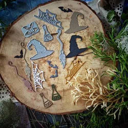 В наборе 5 ножей. Размеры вырубки: шляпа 3,3х4,1 см, паутина - 5х1,8 см, метла - 6,5х1 см, зелье - 2,6х1,5 см, мышки - 2,4х0,8 см и 1,9х1 см.