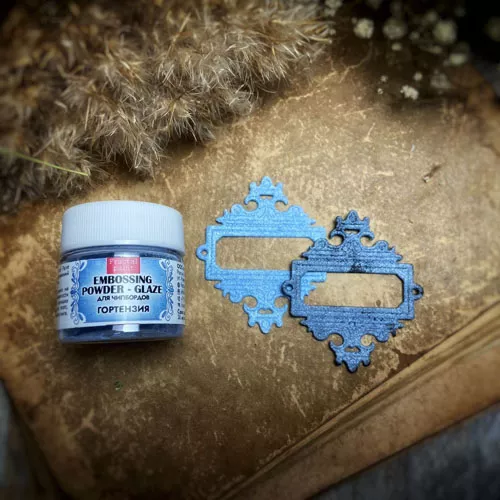 При запекании пудра создает непрозрачное покрытие с легкой текстурой. Способ применения: нанесите клей для эмбоссинга на штамп или нарисуйте кистью на поверхности задуманный рисунок, затем нанесите пудру для эмбоссинга, пудра останется только там, где был нанесен клей, излишки пудры стряхните обратно в баночку. После этого, нагрейте полученный оттиск феном для горячего эмбоссинга, пока пудра полностью не расплавится