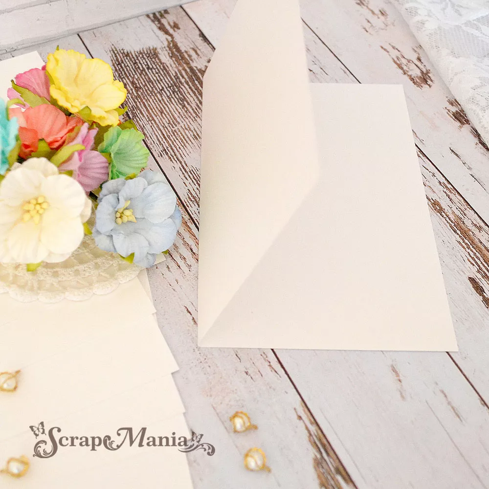 Размер заготовки в сложенном виде 10х15 см, в развернутом виде 20х15 см. Плотная бумага с перламутровой поверхностью и двусторонним покрытием. Плотность 290 г/м2. Не содержит лигнина. Кремовый оттенок и нежное жемчужное сияние - отличное начало трогательной открытки